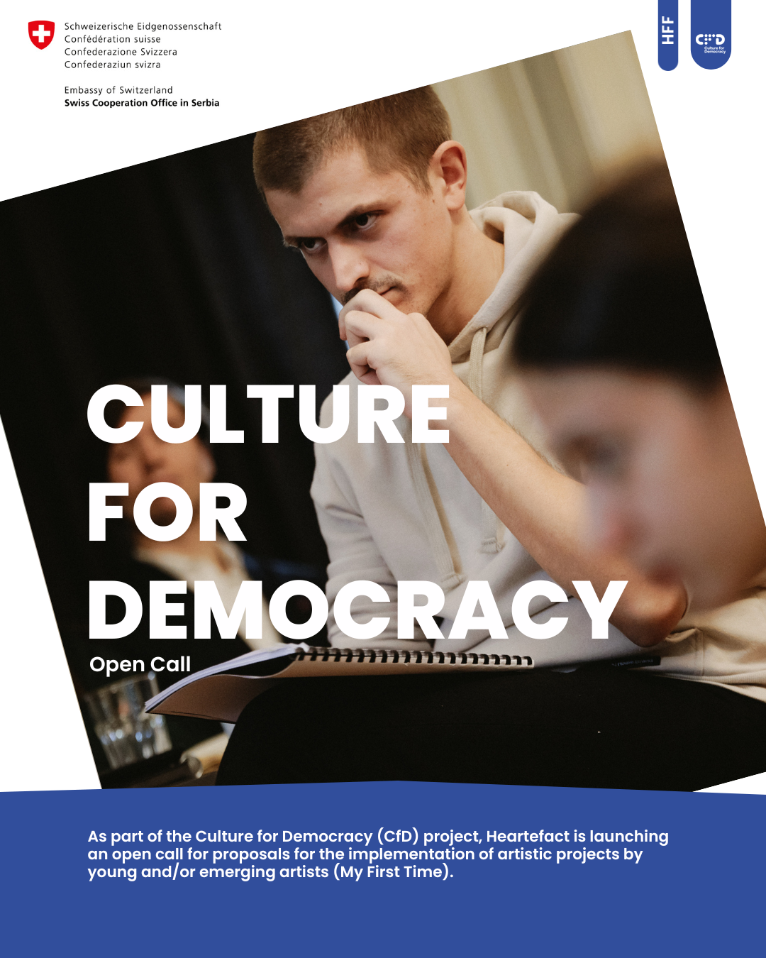 As part of the Culture for Democracy (CfD) project, Heartefact announces a call aimed at encouraging and supporting the artistic production of young and/or emerging artists in Serbia by enabling them to develop and publicly present their first independent or early artistic productions, initiatives, and/or works.